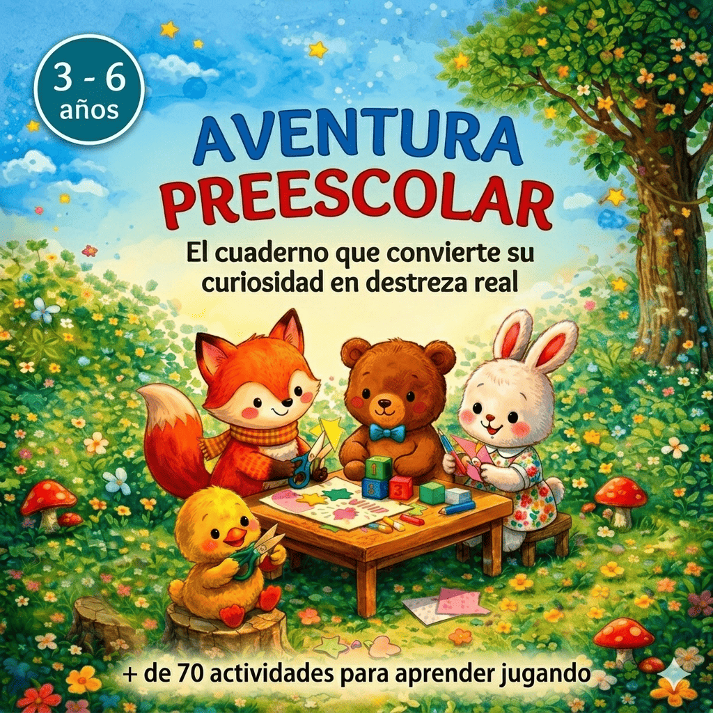 Aventura Preescolar incluye un paquete completo de actividades educativas en formato PDF listas para imprimir, diseñadas para que los niños aprendan de manera divertida mientras desarrollan habilidades básicas como números, letras, lógica y motricidad.